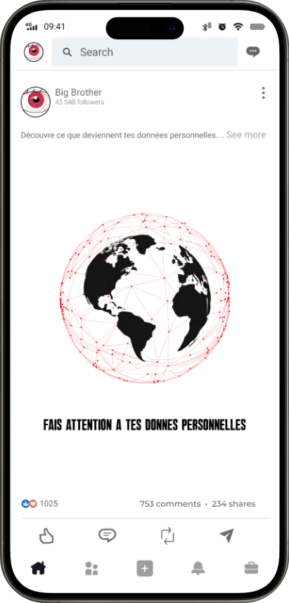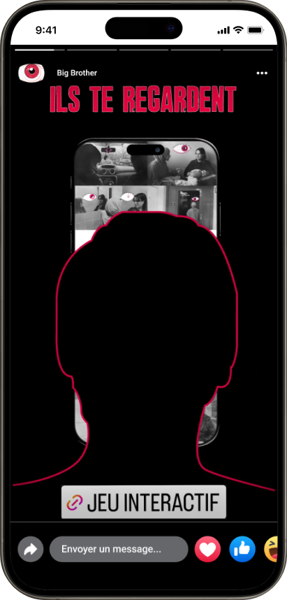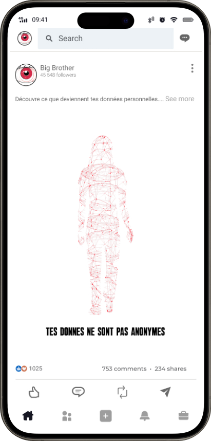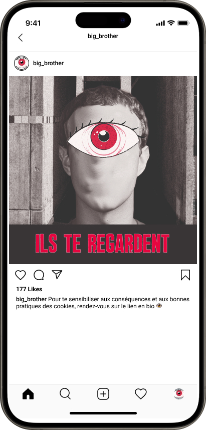 Les affiches ont été pensées pour choquer l’utilisateur et l’interpeler immédiatement. Ces dernières montrent différentes personnalités publiques liées à la récupération des données personnelles. Les visages de ces personnes sont masqués par un œil rouge inspiré de “Big Brother” pour induire le fait que ces personnes nous surveillent constamment en récupérant nos données personnelles via les cookies. Le titre “Ils te regardent” accentue cette dimension de peur et permet à l’utilisateur de se sentir directement concerné.