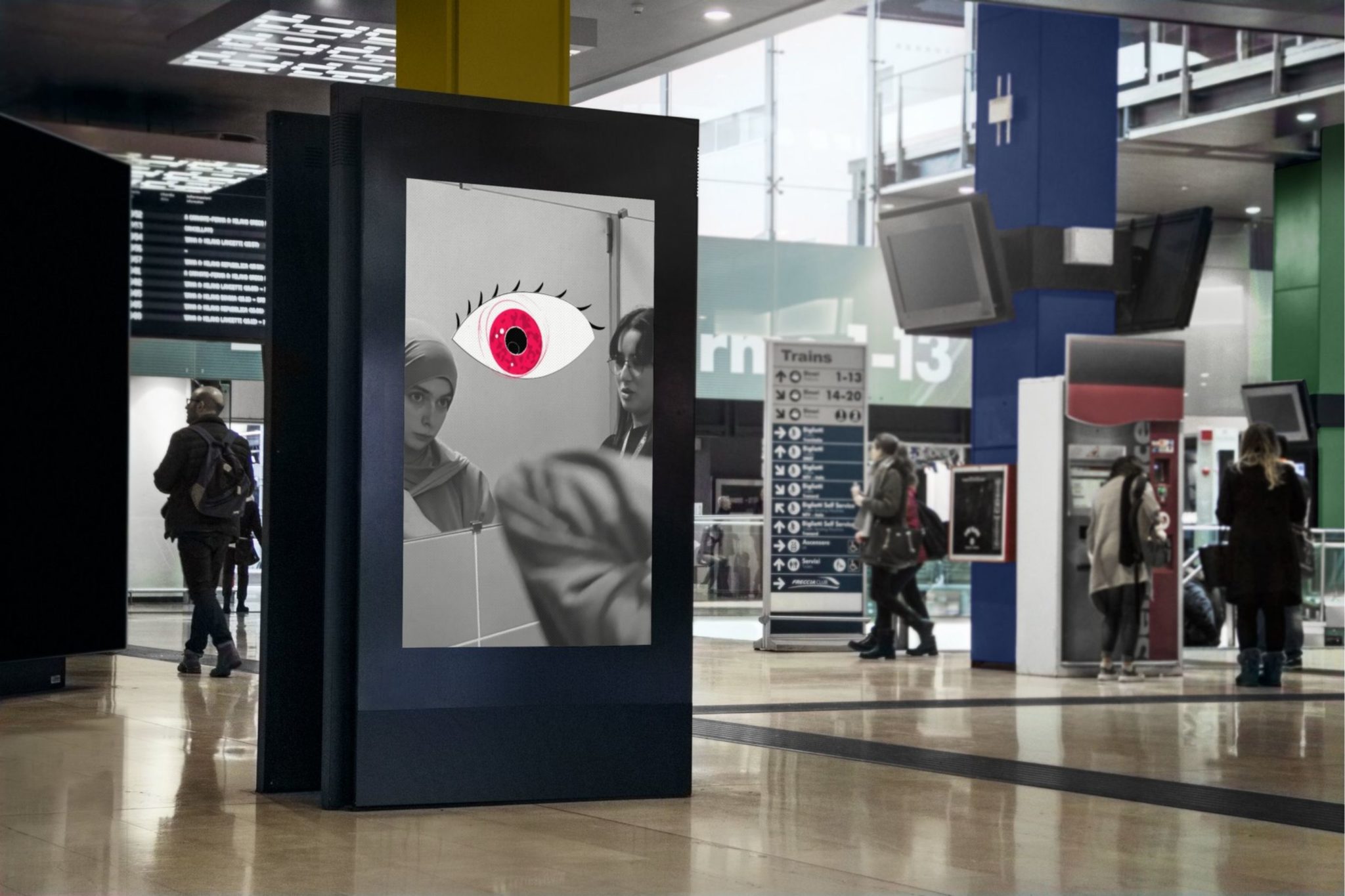 Les vidéos des étudiantes surveillées par l’œil pourraient être utilisées séparément dans une campagne de communication sur des totems animés ou sur les réseaux sociaux.